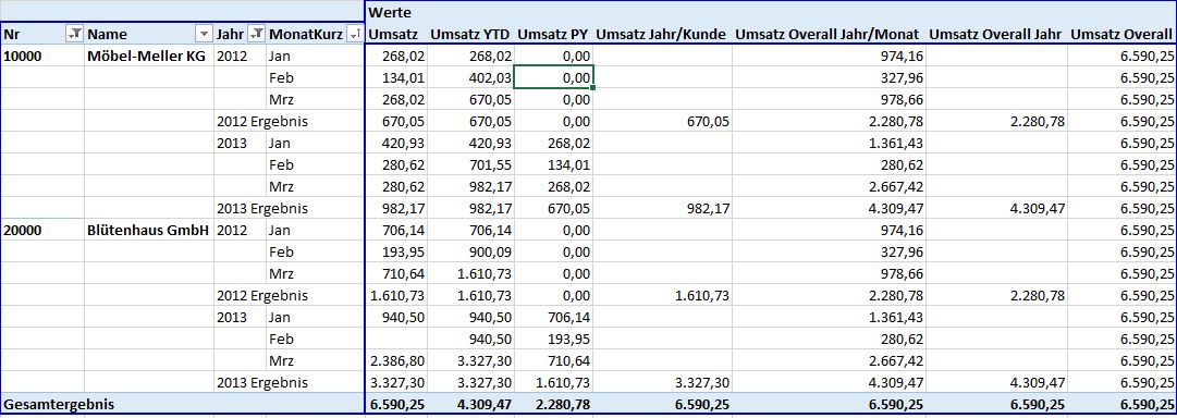 Das Beispiel eignet sich auch hervorragend dafür, einige DAX-Befehle wie CALCULATE, SUMX, HASONEVALUE, IF, ALLEXCEPT, ALL, DATEADD und DATESYTD näher zu betrachten.