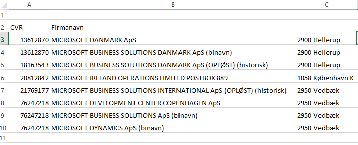 First I found a list of all the companies in Denmark where the name Microsoft was included.