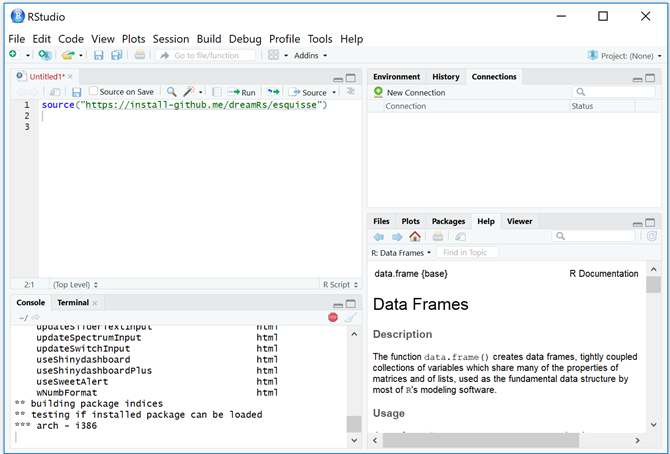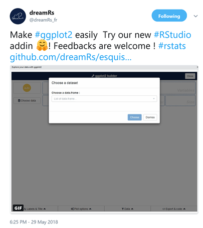 To install the addin you can follow the instructions on the github site for the addin – https://github.com/dreamRs/esquisse