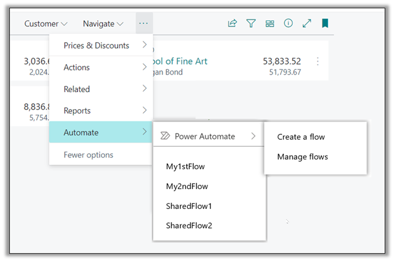 Every card and document page that runs in the context of a data table now features a newAutomategroup in the action bar. From that group, users can run manual flows defined for Business Central.